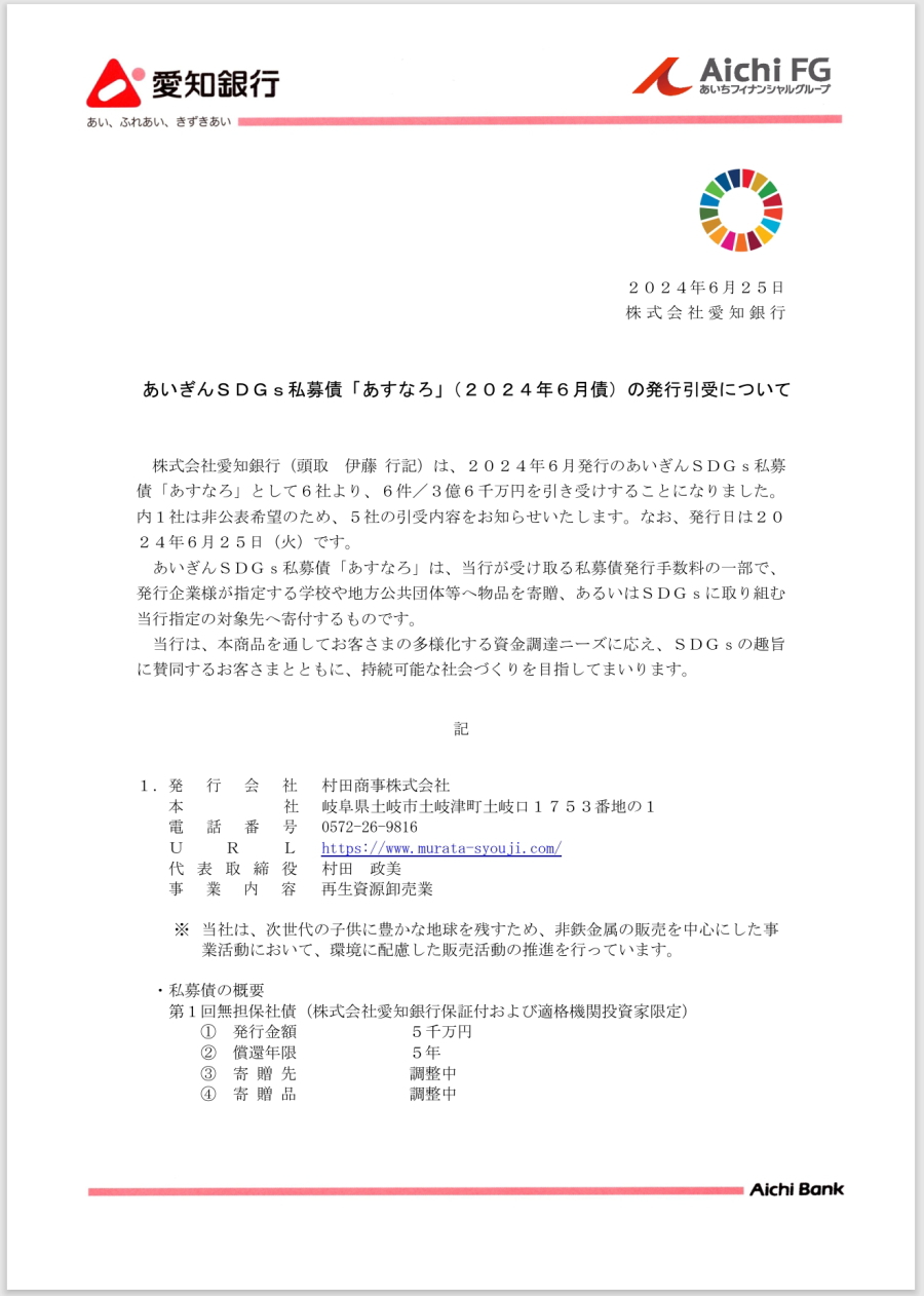 株式会社愛知銀行へ、2024年6月発行のあいぎんSDGs私募債「あすなろ」として5千万円を発行することになりました。