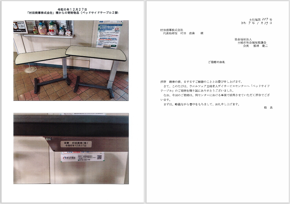 ウェルフェア土岐老人デイサービスセンターへ 「ベッドサイドテーブル」を寄附しました。